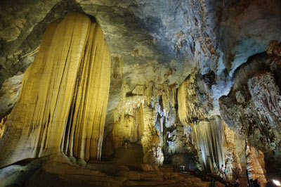 Ðến cửa động, thật bất ngờ, cửa chỉ nhỏ vừa đủ một người xuống, nằm dưới lèn đá cao hơn trăm mét trông rất ngoạn mục. Một cái dốc dẫn xuống nền động dài 15m, dốc được tạo rất cầu kỳ với vô vàn hạt thạch nhũ to tròn, hai bên dốc có nhiều dấu tích sập đổ, ngổn ngang những cột thạch nhũ như thể vừa trải qua một đợt kiến tạo. Khi đèn pha 1.000W bật lên, ánh sáng rọi đến đâu, mọi người ngạc nhiên đến đó vì vẻ đẹp tráng lệ chưa bao giờ gặp với vô vàn thạch nhũ hoành tráng hiện ra. Trần hang cao hơn 100m, bề rộng hơn 200m, đoàn người tha hồ ngắm nhìn. Ðặc biệt ở động có những hình ảnh giống biểu tượng văn hóa các vùng miền, ở sâu trong động có nhiều thớ đá thoải ra thành bậc thang rất uyển chuyển, dài hun hút và phân bậc như ruộng bậc thang, giữa động có những cái ô như biểu trưng của văn minh lúa nước, nhiều cột thạch nhũ hình tháp Chăm pha điểm rất đẹp.
